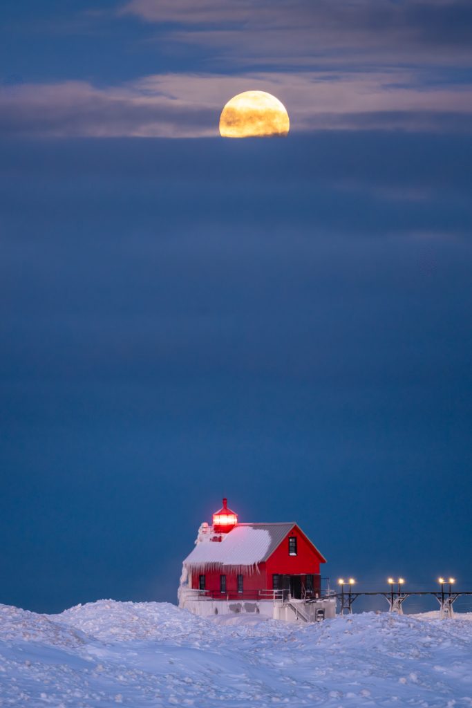 In early February 2026, I took a few days off to travel north to Michigan, hoping to get some nice photos of the lighthouses along the western coast of the state. I love traveling to this area in the winter when there’s ice and snow and every day brings something different. In addition, I timed my trip with a full moon, hoping to get some shots of the moon and lighthouses.